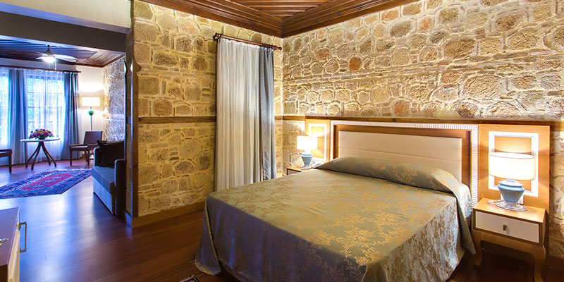 특별한 청록색 침구류는 따뜻한 색조의 목재 바닥 및 천장과 어우러져 매혹적인 스위트룸에 우아함을 더해줍니다